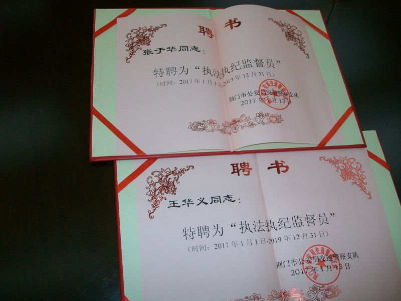交警在對(duì)他們進(jìn)行獎(jiǎng)勵(lì)外,并給他們頒發(fā)了荊門交警支隊(duì)執(zhí)法執(zhí)紀(jì)監(jiān)督員聘書。