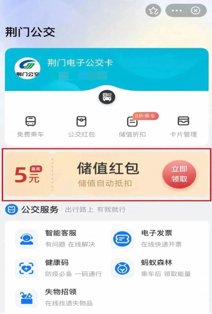 02點擊“荊門公交”,領取“儲值紅包"后點擊【去優(yōu)惠充值】,完成優(yōu)惠儲值