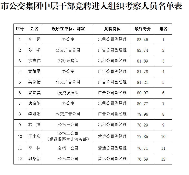 根據(jù)市公交集團(tuán)中層干部競(jìng)聘工作要求,共有12名競(jìng)聘者(最終得分前12名)進(jìn)入組織考察環(huán)節(jié),現(xiàn)將人員名單公示如下(見附件)。