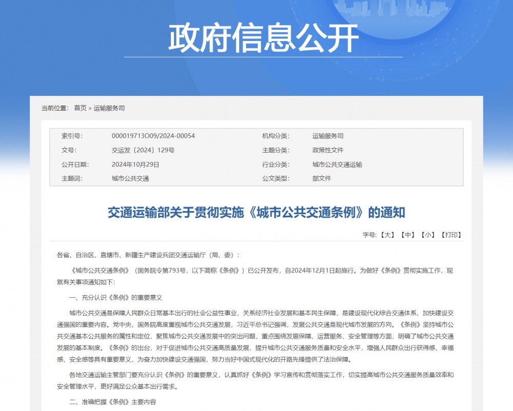 10月29日,交通運(yùn)輸部網(wǎng)站發(fā)布《關(guān)于貫徹實(shí)施〈城市公共交通條例〉的通知》。通知提到,從充分認(rèn)識《條例》的重要意義、準(zhǔn)確把握《條例》主要內(nèi)容、有力保障《條例》落地實(shí)施來貫徹實(shí)施。