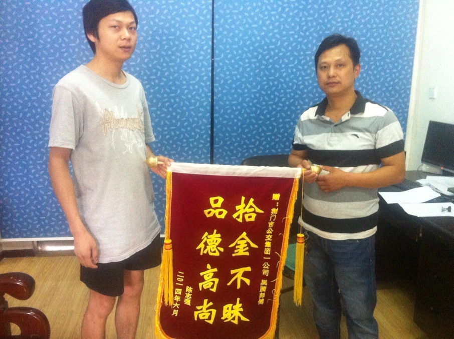原來,15日下午2時(shí)許,1路公交車司機(jī)吳騰驅(qū)車途經(jīng)城區(qū)長寧大道長寧8號(hào)廣場(中百倉儲(chǔ))公交站點(diǎn)時(shí),在馬路中央撿到一個(gè)黑色皮包,并及時(shí)上交到公交集團(tuán)公汽一公司。公司負(fù)責(zé)人將皮包內(nèi)身份證信息通過《荊門晚報(bào)》及荊門社區(qū)網(wǎng)絡(luò)媒體發(fā)布尋找失主陳先生信息,陳先生看到招領(lǐng)信息后,很快得知錢包的下落了,他說這(找回錢包)是他萬萬沒想到的。18日上午,陳先生順利地從公汽一公司負(fù)責(zé)人手中認(rèn)領(lǐng)到丟失的錢包,并特意為吳師傅制作了一面"拾金不昧 品德高尚"錦旗表示謝意。