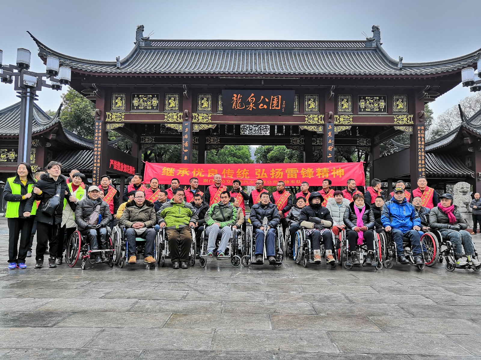 20輛雷鋒車整齊列隊停靠,25名輪椅人5名盲人朋友在雷鋒的哥和公交志愿者的協(xié)助下安全乘上車,輪椅車統(tǒng)一集中搬運,開始下一階段活動,陪殘疾朋友游玩龍泉公園。